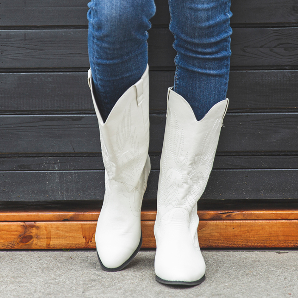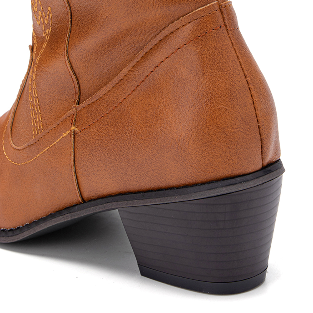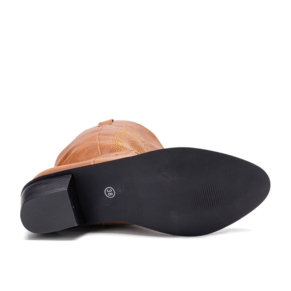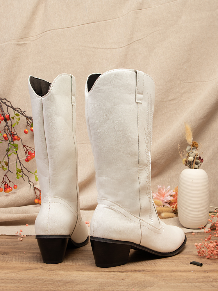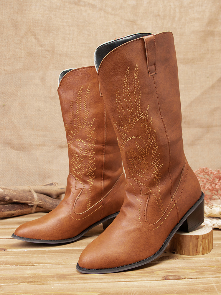 Women Leather Embroidery Pattern Pointy Toe Chunky Heel Trendy Knight Cowboy Boots