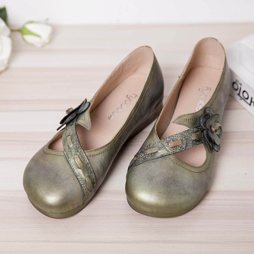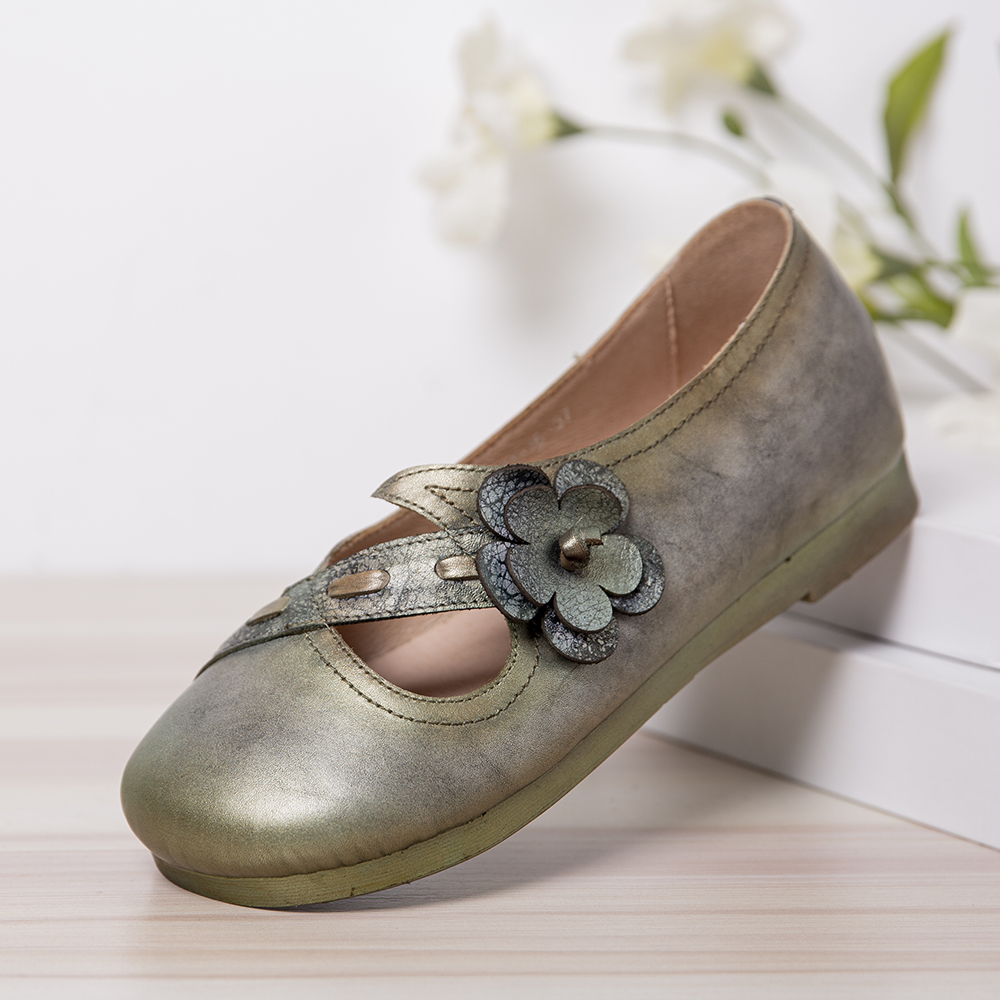 Vintage Handmade Soft Leather Floral Strap Green Slip on Flat Shoes