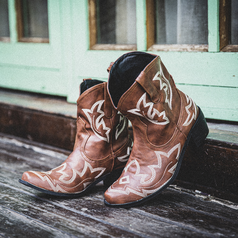 Women Folkways Floral Embroidered Chunky Heel Slip-On Short Cowboy Boots