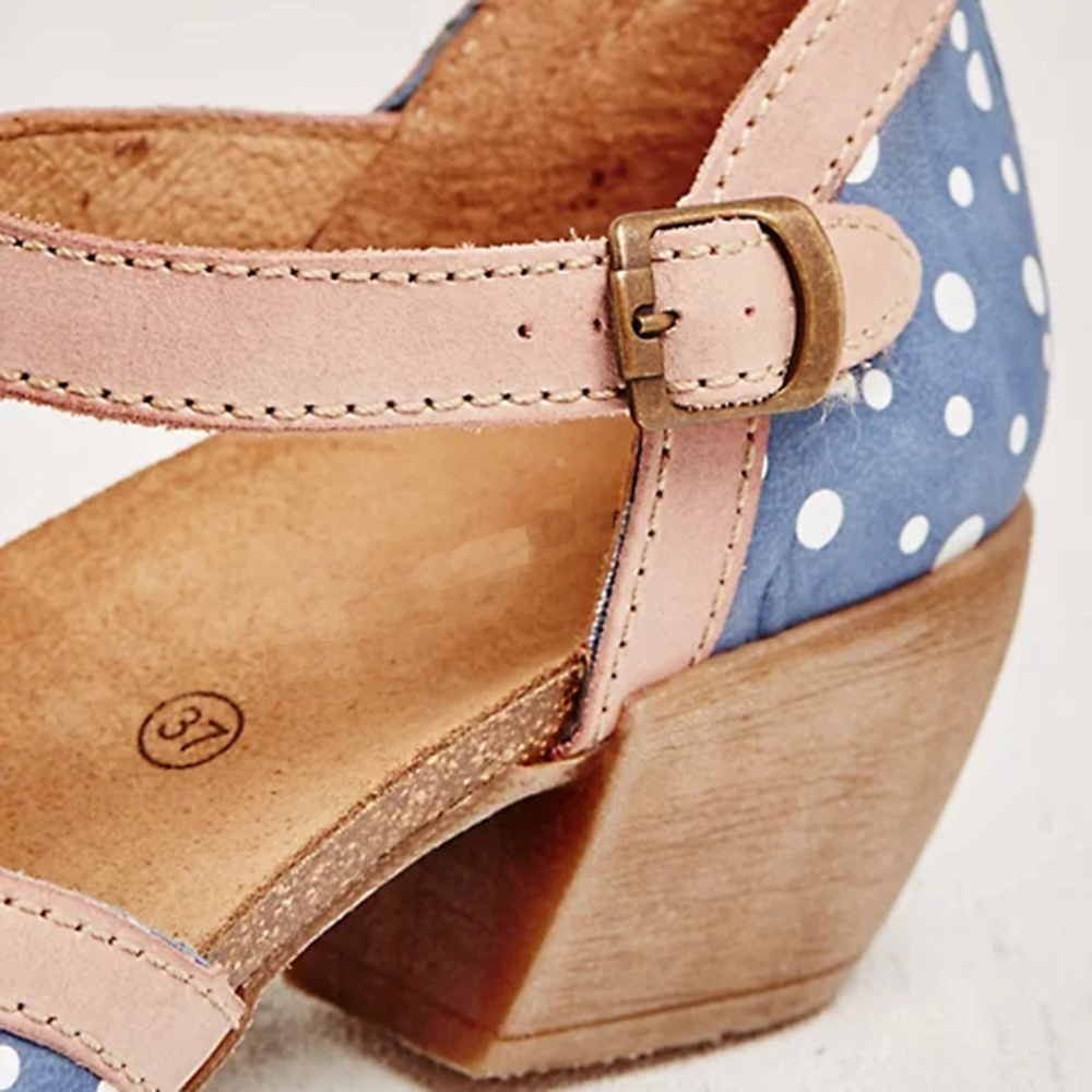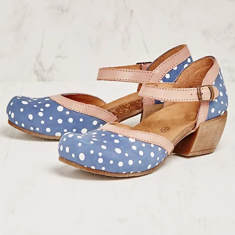 Women Polka Dot Round Toe Ankle Strap Block Heel Casual Comfy Heels Pumps